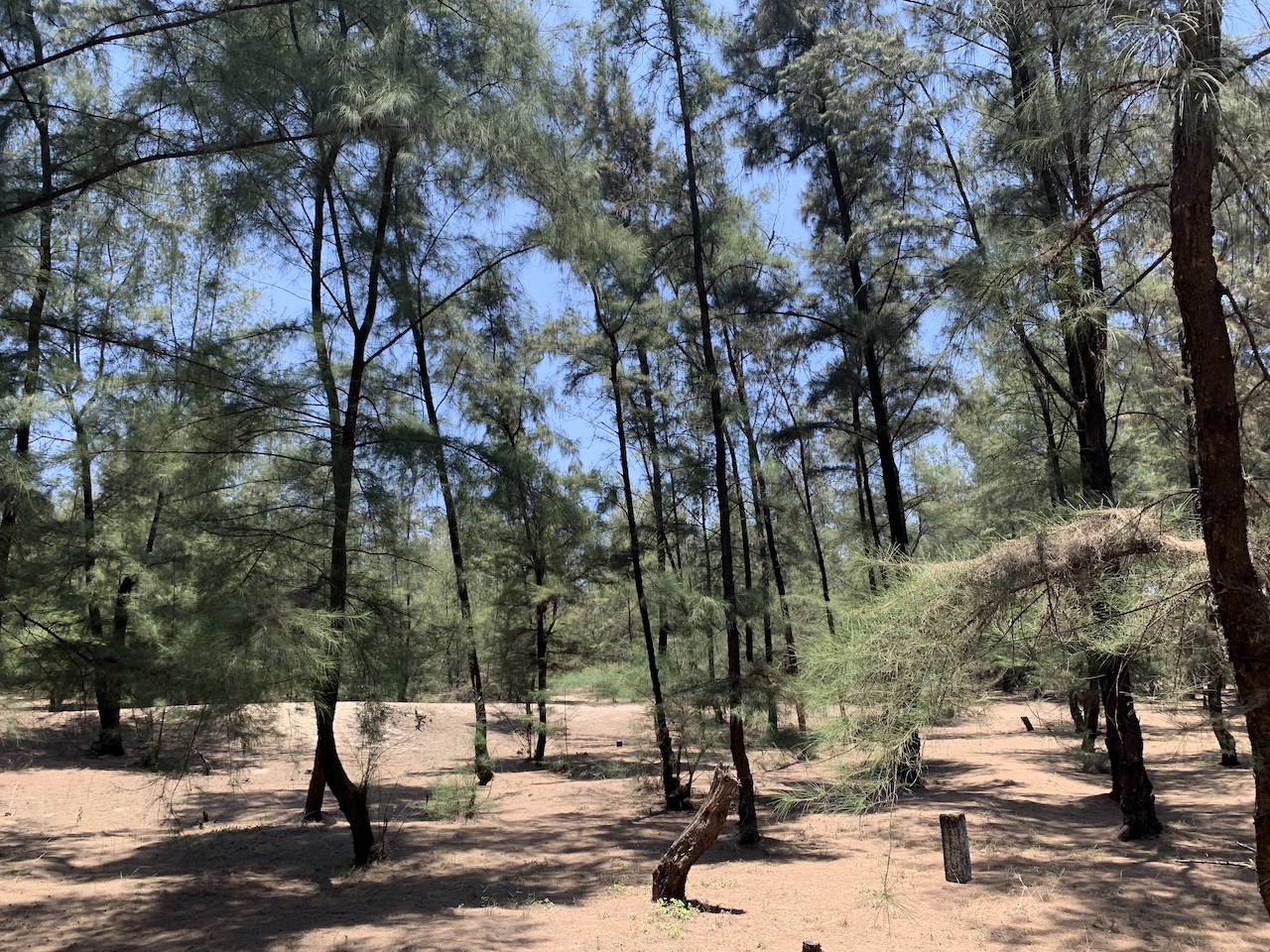 Toujours sur les cartes en ligne, on distingue deux populations d’arbres : les plus vieux et hauts au centre du cordon sableux, les plus jeunes plus proches de la mer et plantés de façon trop régulière. Ce sont les hommes qui ont planté ces arbres, probablement pour stabiliser le sable et protéger la lagune.