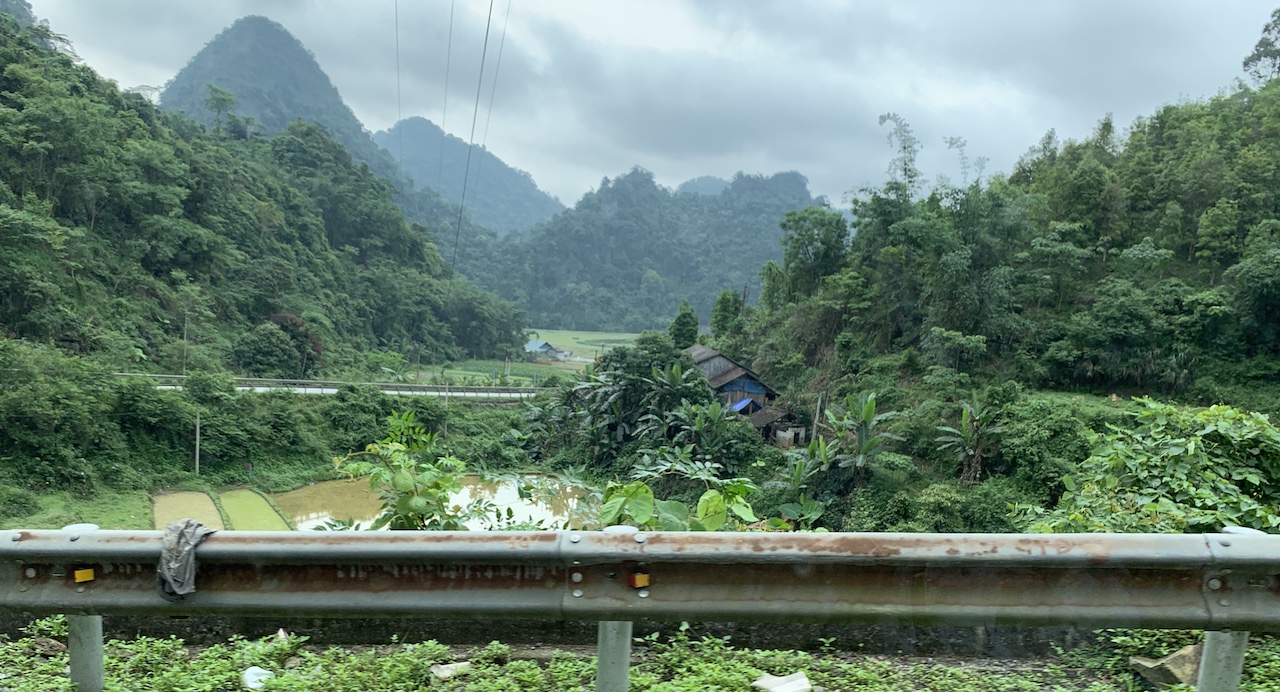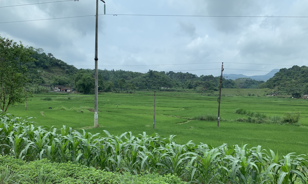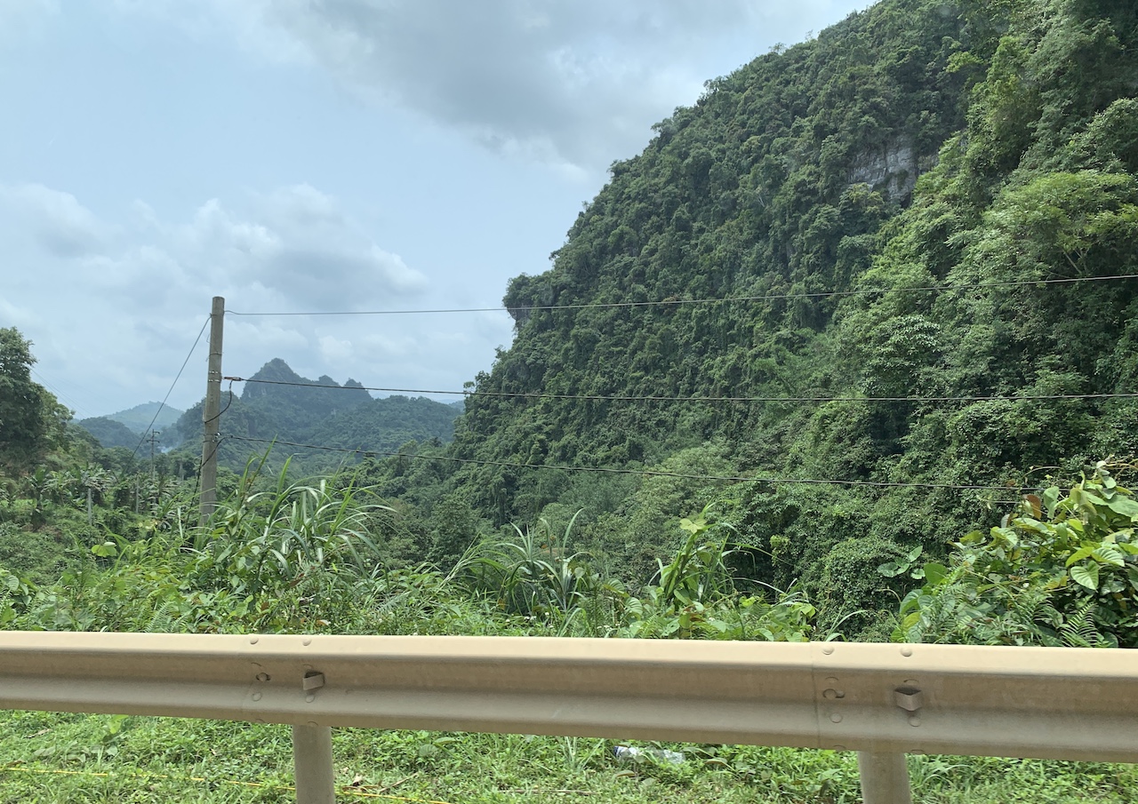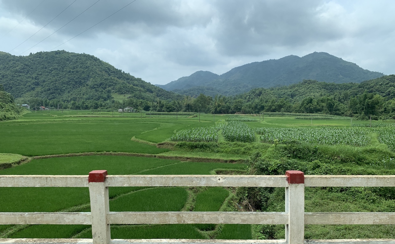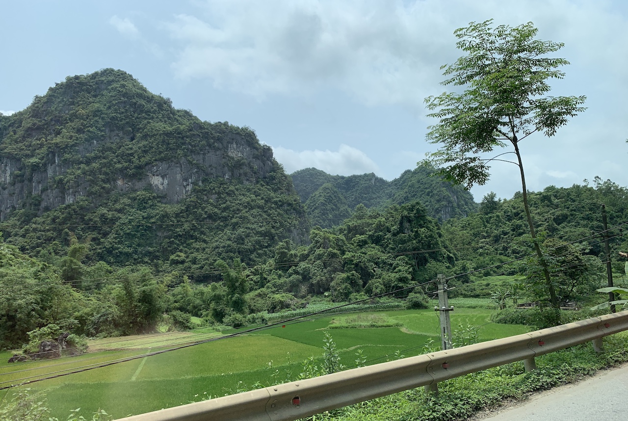 La route n’est pas rouge, mais verdoyante. L’ancienne RC4 pour route coloniale 4 a été rebaptisée QL4A. Et ce n’est pas une ligne droite, contrairement à que ce pourrait suggérer les cartes. Toujours de la (petite) montagne, toujours les pains de sucre calcaires, toujours les champs de maïs ou de riz. Les espaces entre pitons karstiques sont quand même plus espacés, les terrains plats plus grands que ceux vus les jours précédents. Ce serait presque bucolique, mais la présence de paysans et ouvriers sur la route est là pour rappeler que le travail est dur ici aussi.