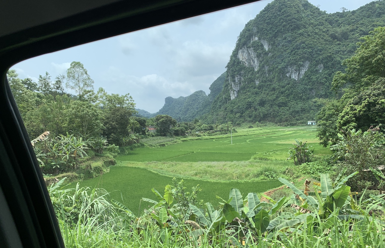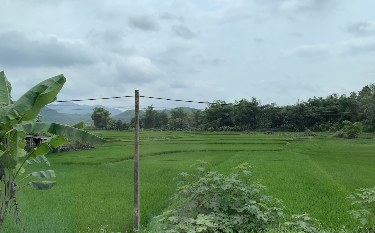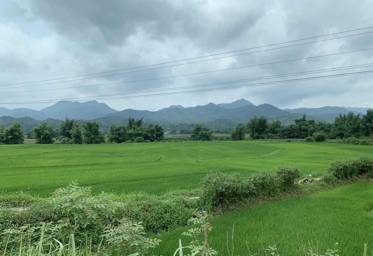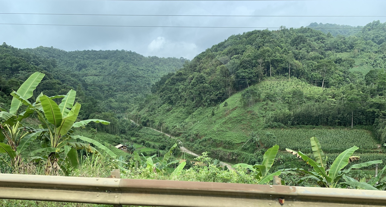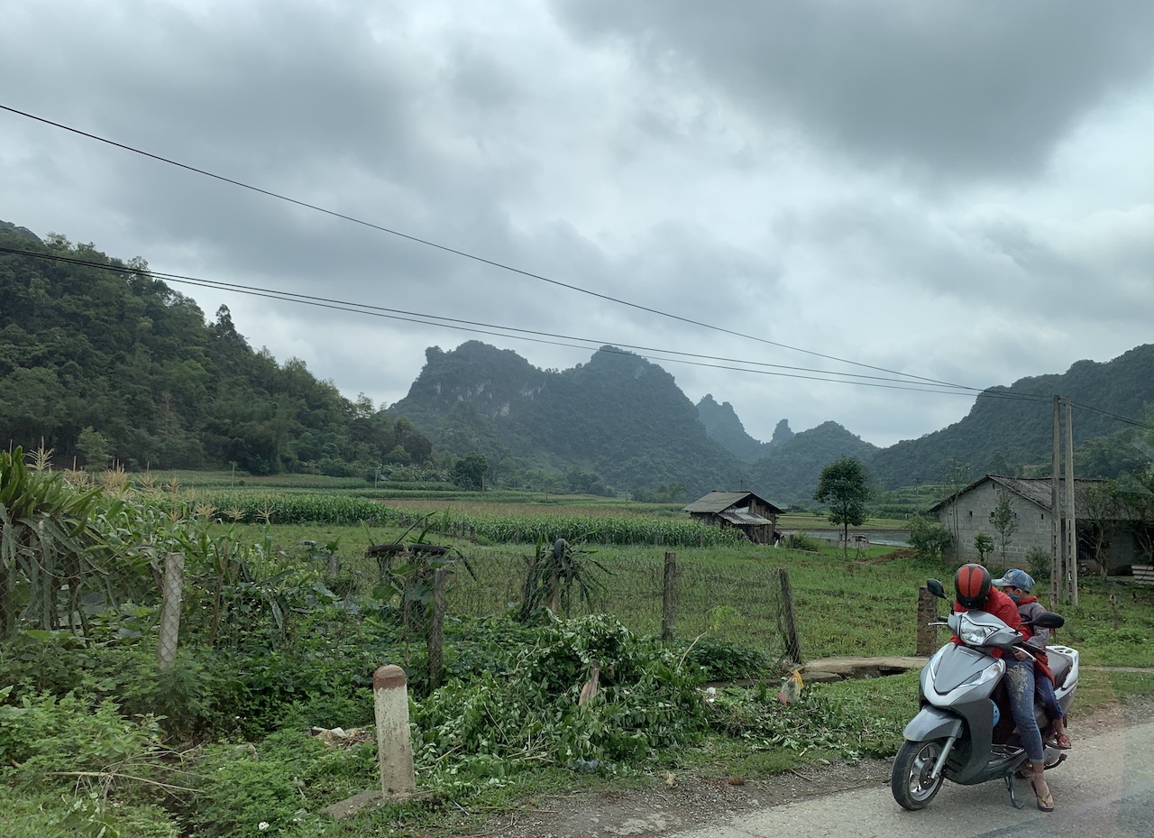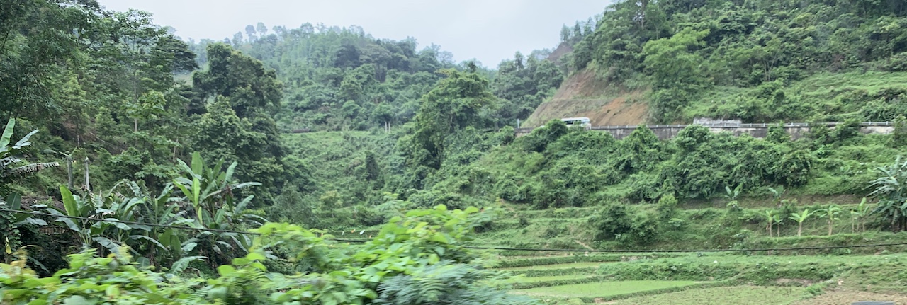 La route n’est pas rouge, mais verdoyante. L’ancienne RC4 pour route coloniale 4 a été rebaptisée QL4A. Et ce n’est pas une ligne droite, contrairement à que ce pourrait suggérer les cartes. Toujours de la (petite) montagne, toujours les pains de sucre calcaires, toujours les champs de maïs ou de riz. Les espaces entre pitons karstiques sont quand même plus espacés, les terrains plats plus grands que ceux vus les jours précédents. Ce serait presque bucolique, mais la présence de paysans et ouvriers sur la route est là pour rappeler que le travail est dur ici aussi.