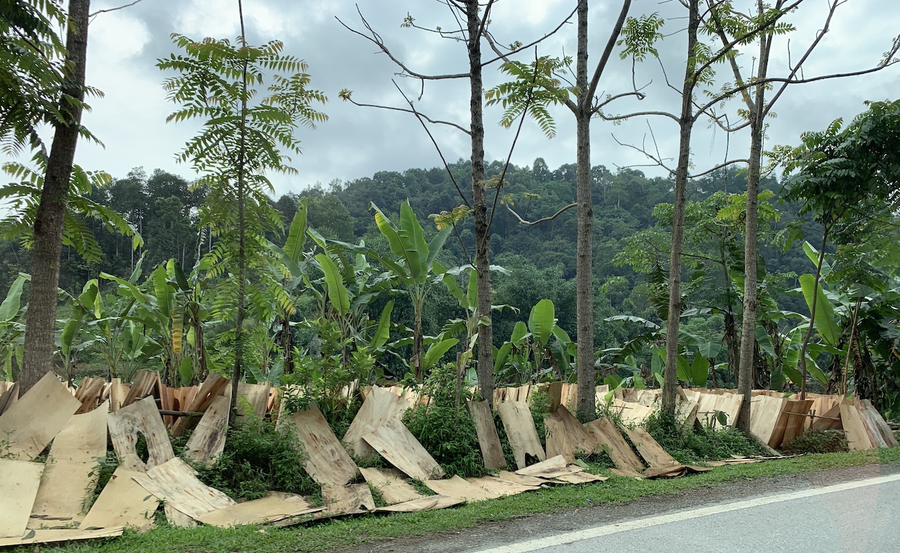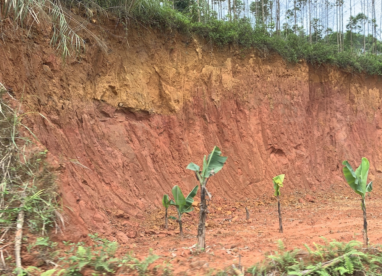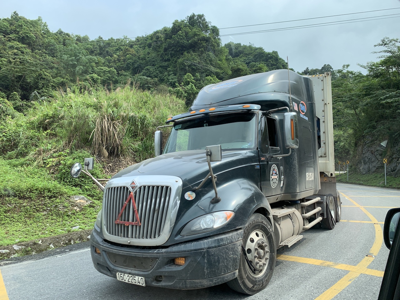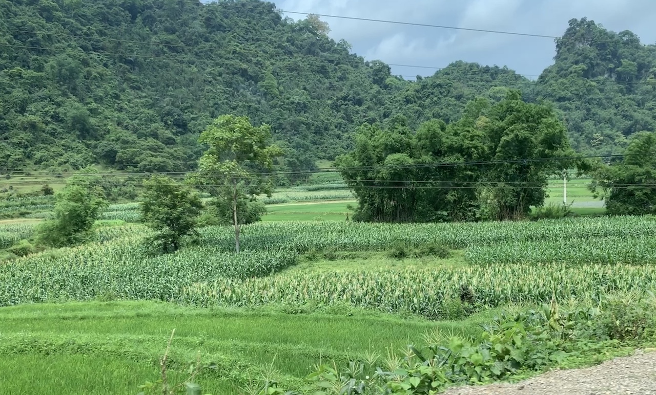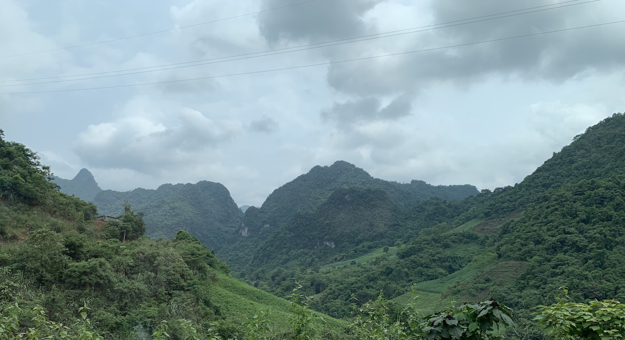 La route n’est pas rouge, mais verdoyante. L’ancienne RC4 pour route coloniale 4 a été rebaptisée QL4A. Et ce n’est pas une ligne droite, contrairement à que ce pourrait suggérer les cartes. Toujours de la (petite) montagne, toujours les pains de sucre calcaires, toujours les champs de maïs ou de riz. Les espaces entre pitons karstiques sont quand même plus espacés, les terrains plats plus grands que ceux vus les jours précédents. Ce serait presque bucolique, mais la présence de paysans et ouvriers sur la route est là pour rappeler que le travail est dur ici aussi.