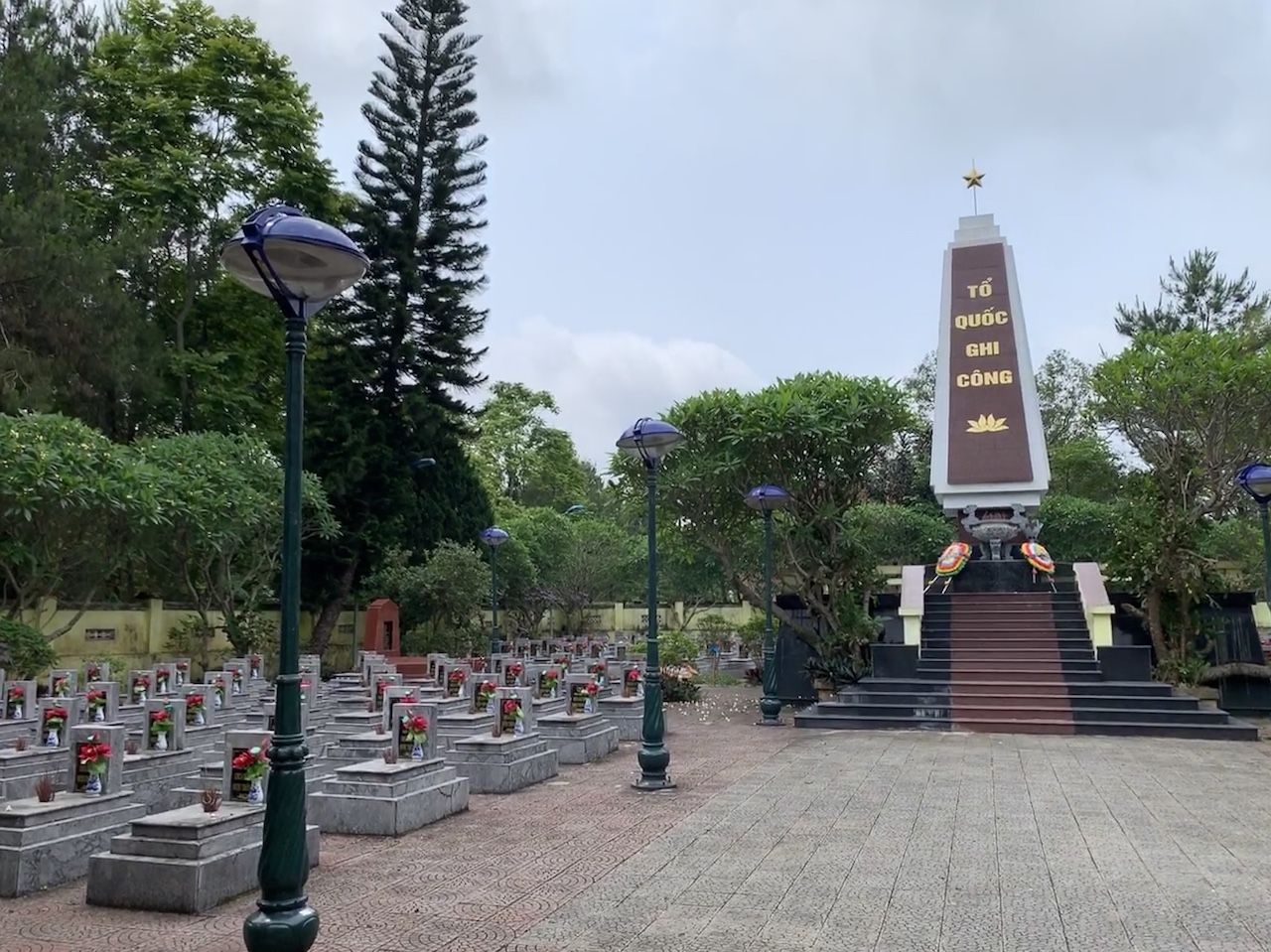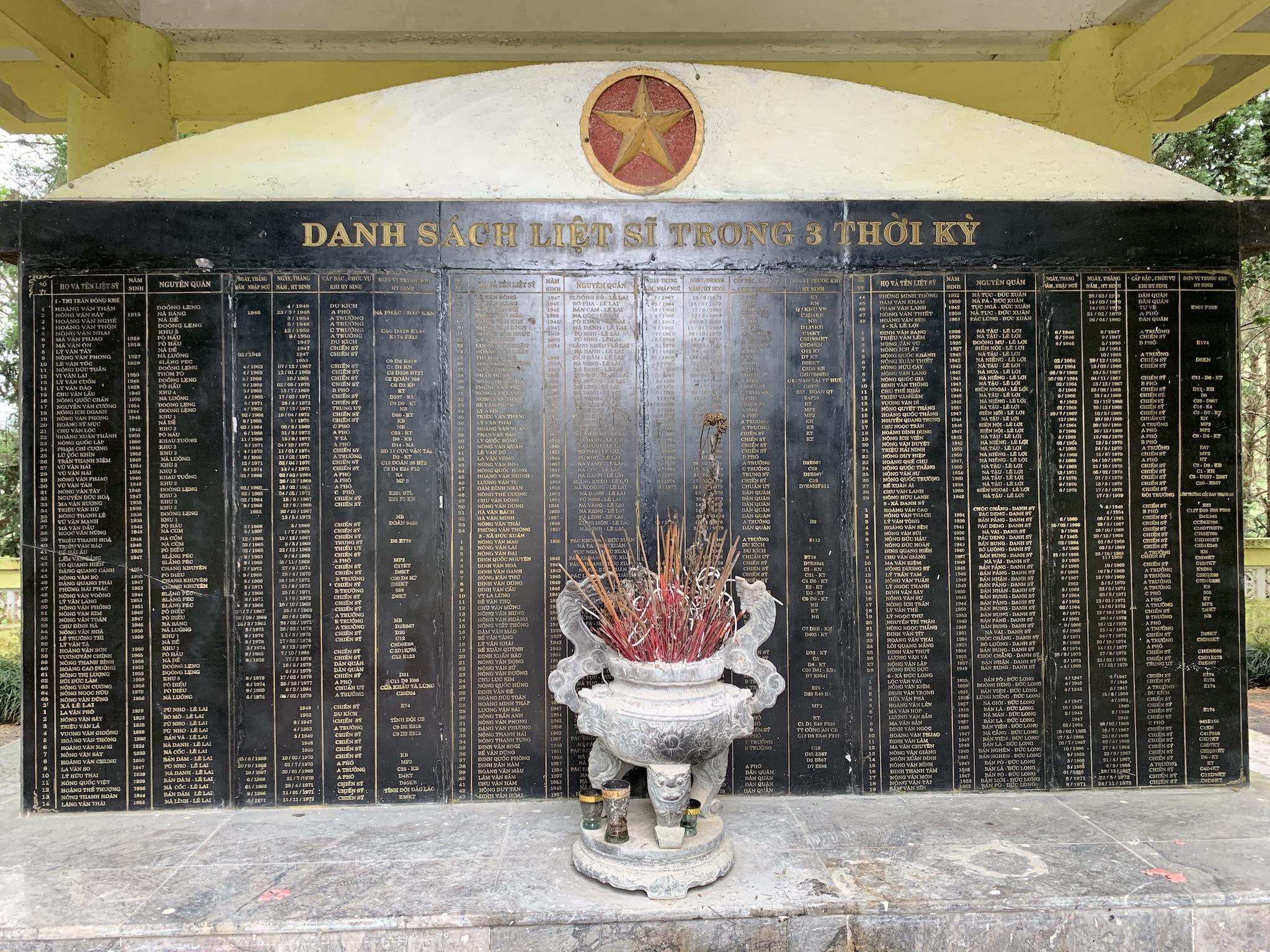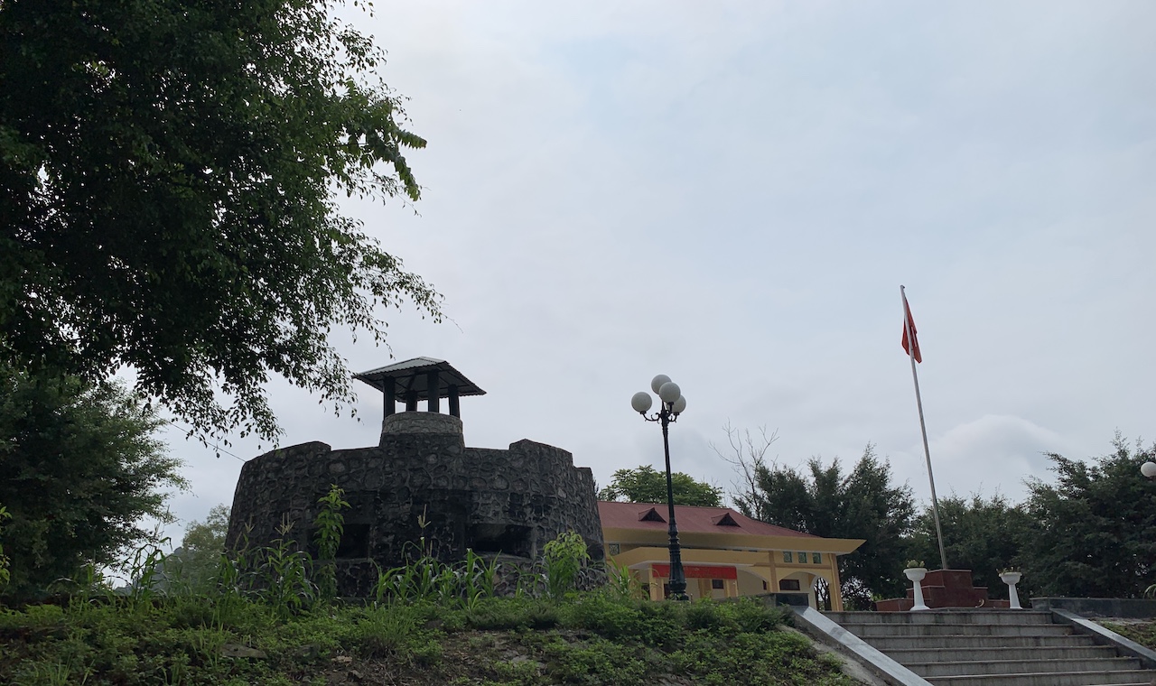 Le chauffeur fait ralentir le véhicule, hésite entre deux voies, et on s’arrête finalement dans une petite ville, au pied d’une colline. Je ne comprends pas au début. A priori, il faut sortir pour une visite. En fait, le nom de la bourgade est différent sur la carte mais on se trouve à Đông Khê, et le sujet de la visite est un ancien fortin français, un des premiers à être reconquis par les forces vietnamiennes. On en a fait un parc mémorial. Quelques murs de l’armée coloniale sont encore là. La terre a tellement été remuée par les bombes, j’ai l’impression que ces murs ont été reconstitués. Un club de musique s’entraîne ici, sans doute pour bénéficier de la tranquilité des lieux. Un cimetière est aussi présent : de nombreuses tombes d’anonymes, et pas seulement de la guerre d’indépendance contre la France, mais aussi de la guerre avec les américains et même celle avec les chinois. Ce cimetière est dédié aux militaires natifs de la région ou morts ici.
